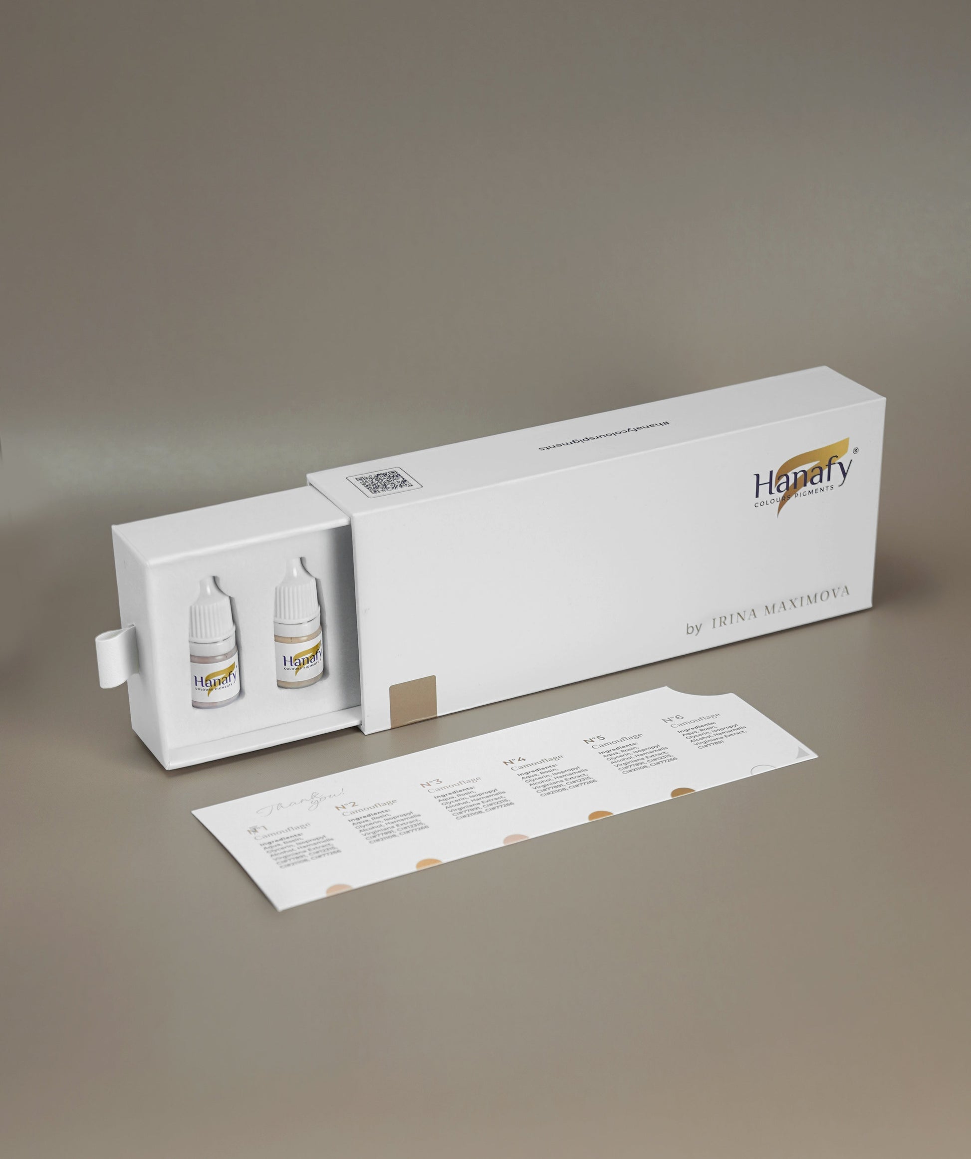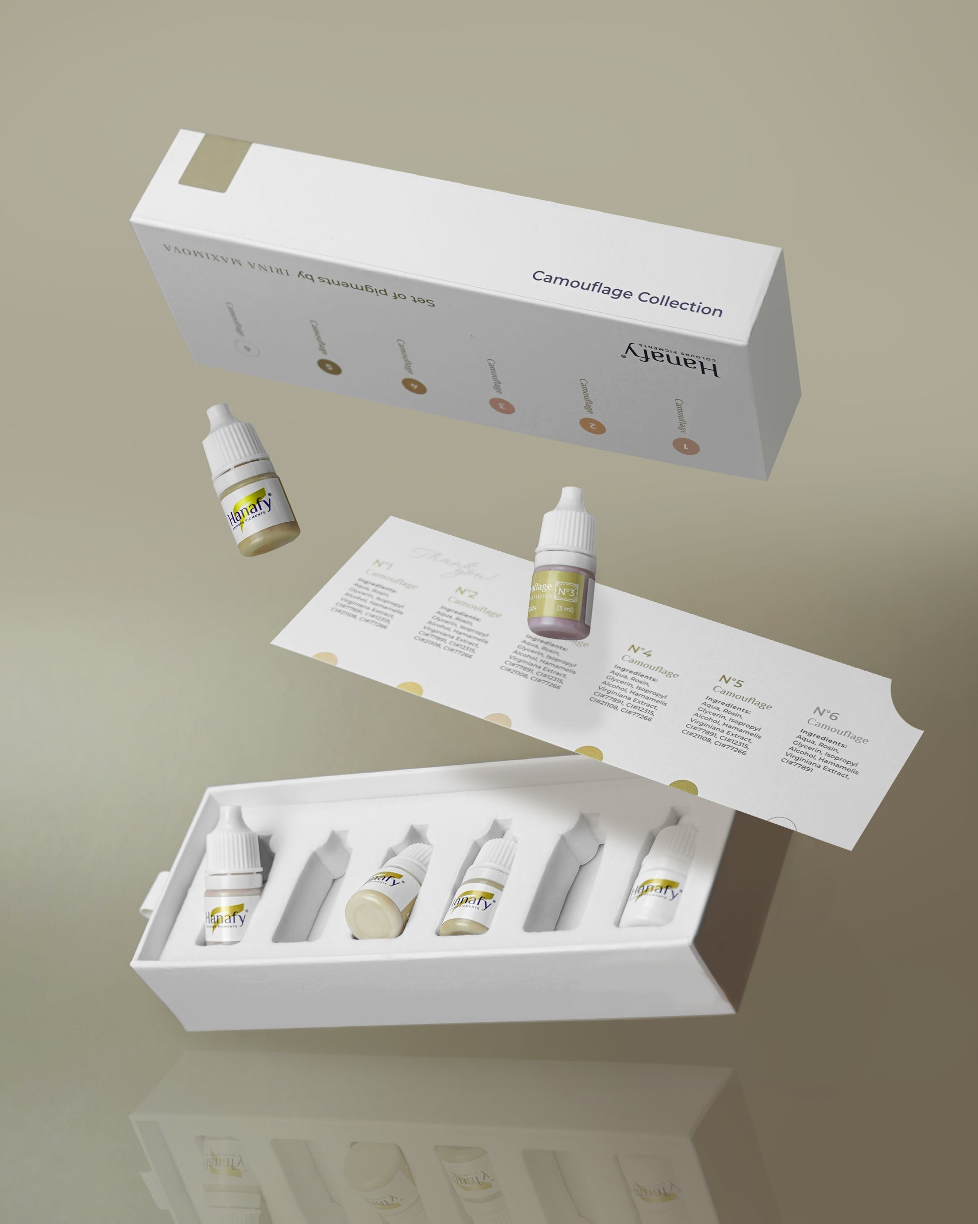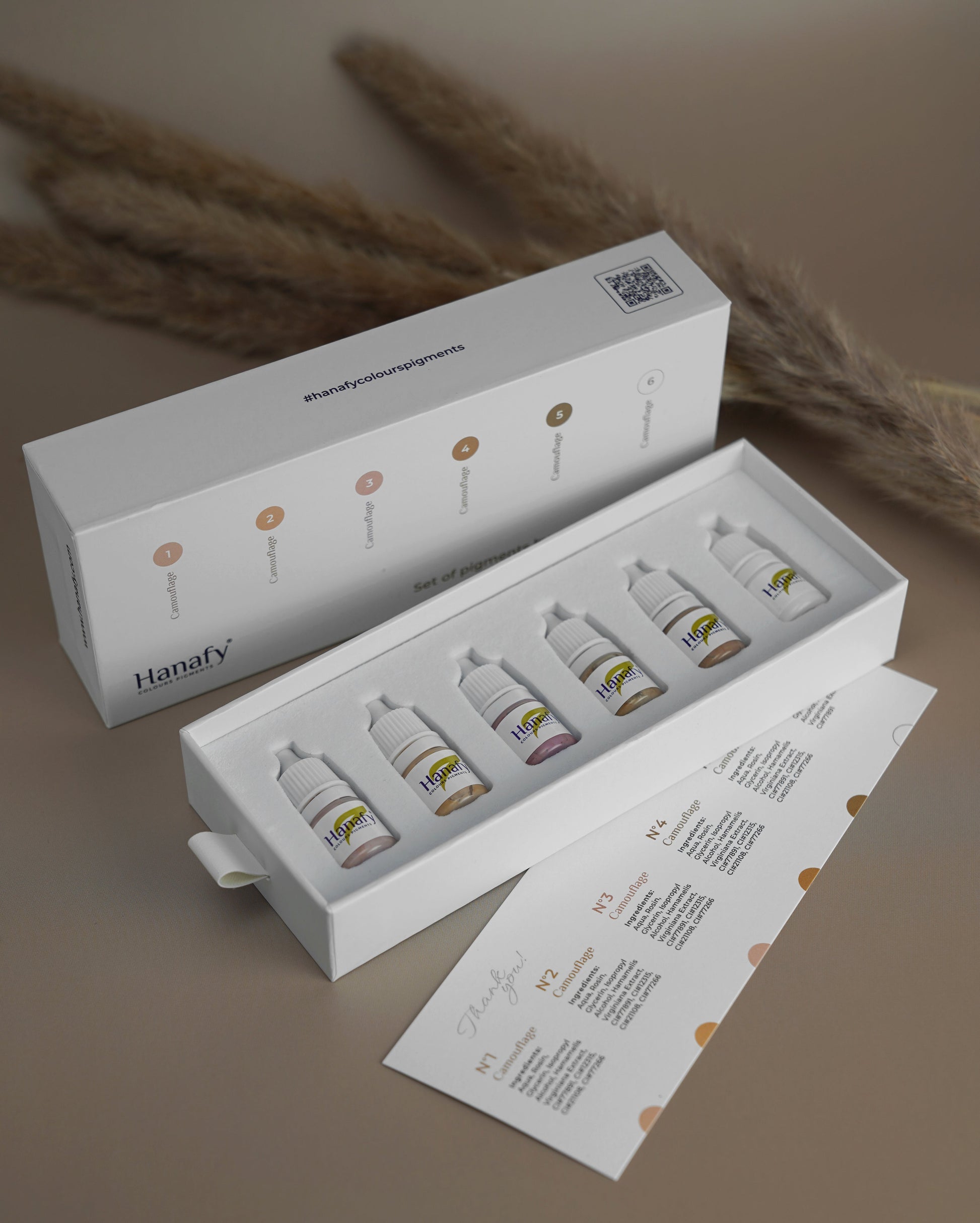 Five hybrid shades and one white mineral pigment. Six essential pigments designed to camouflage vitiligo, stretch marks, scars, and pigmentation irregularities. Also suitable for areola procedures. Can be mixed with Areola and Areola PRO pigments for a fully customized result